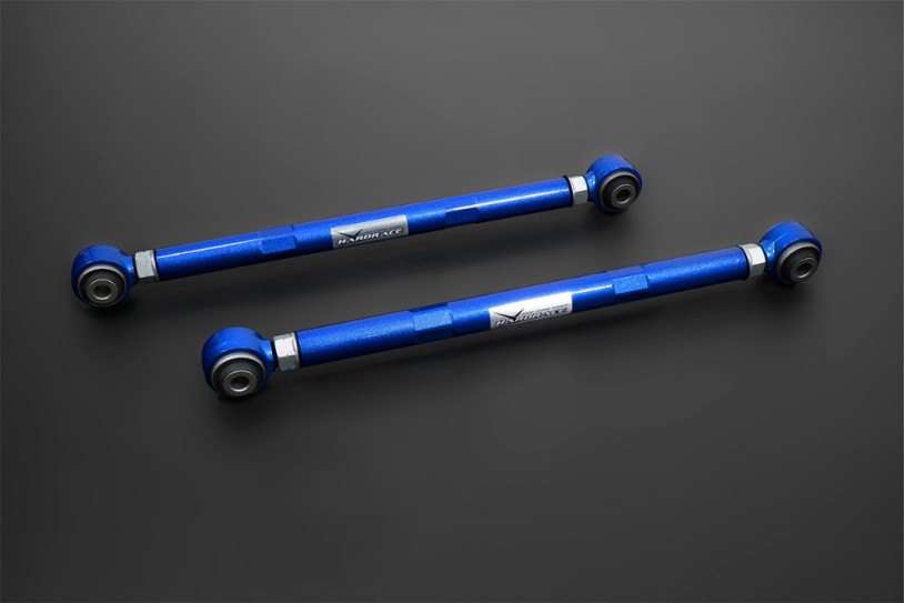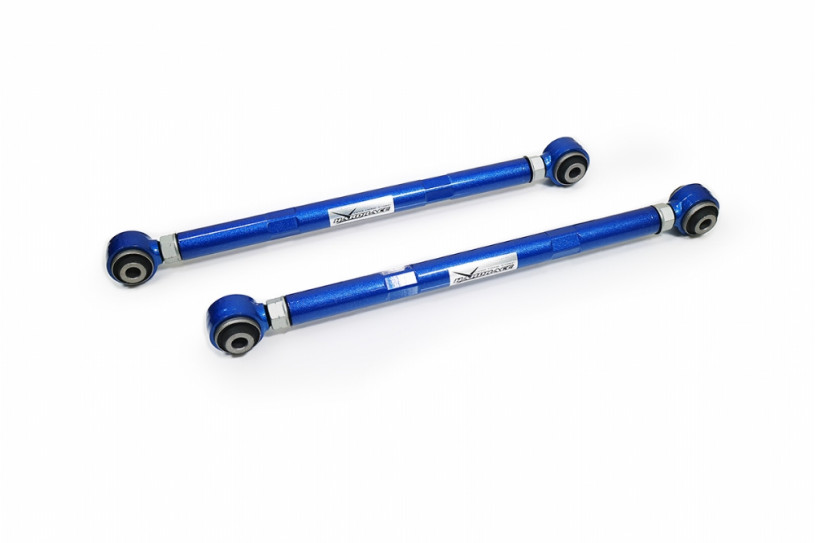 The toe kit allows fine adjustments to the rear end toe in/out setting of the vehicle. It can either help achieve desired handling characteristic or get your car back to original alignment specs after lowering. The arms are made of high-strength steel alloys to offer high durability and strength. The premium quality harden rubber bushings equipped also provide much more precise and solid handling response over the factory components.