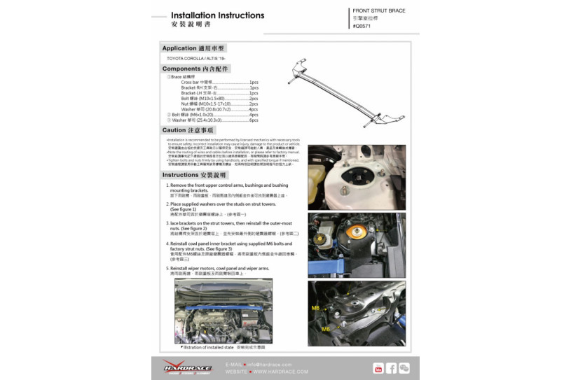 Front Strut Brace Toyota Corolla/Altis/Auris 12th Altis E210 2018- Hardrace Q0571 - Installation Guide.