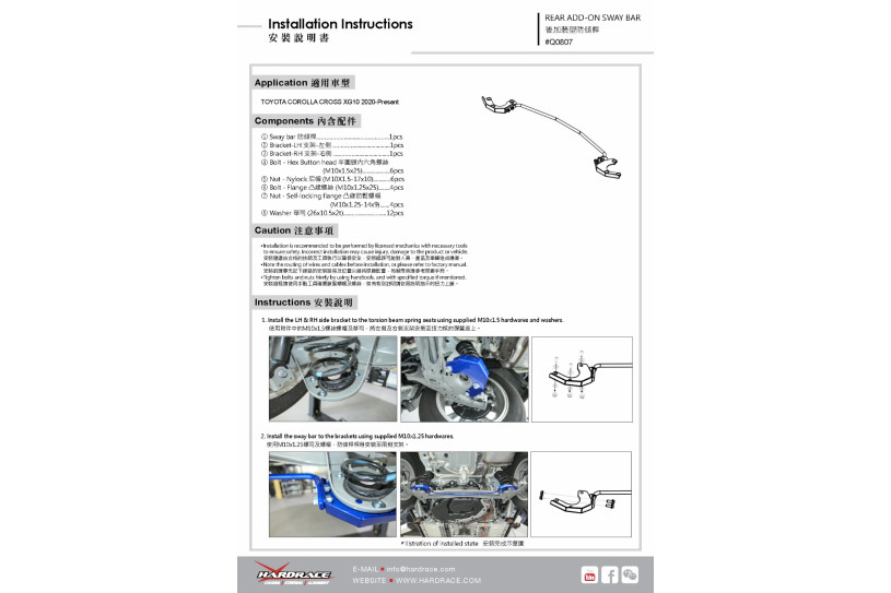 Rear Add-on Sway Bar Toyota Corolla Cross XG10 2020-present Hardrace Q0807 - Installation Guide.
