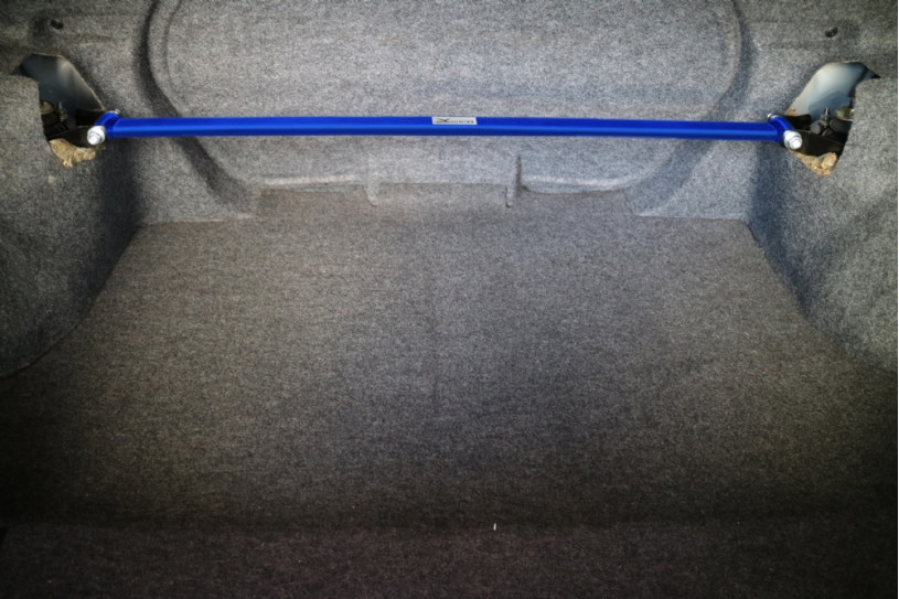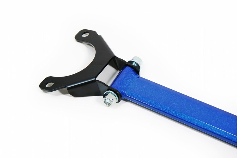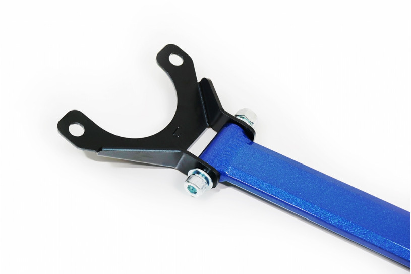 The rear strut brace features aluminum alloy center bar for extreme lightweight and superior strength. By tying the strut towers together, the brace capably eliminate lateral body deflections and maintain proper suspension geometry under high speed driving and hard cornering, offering a more precise and connected handling response.